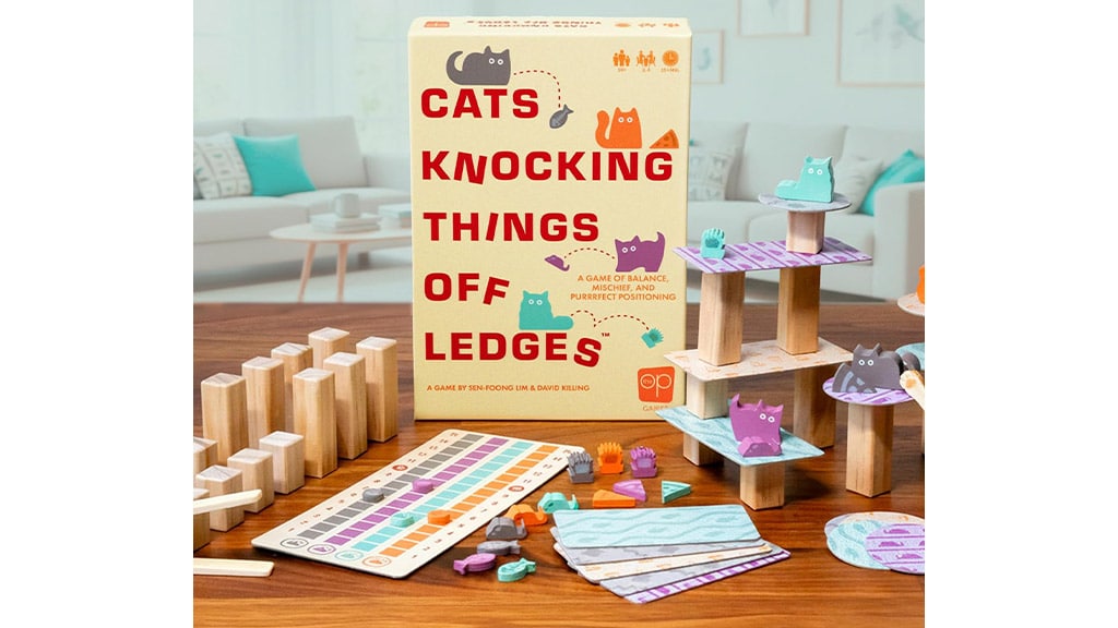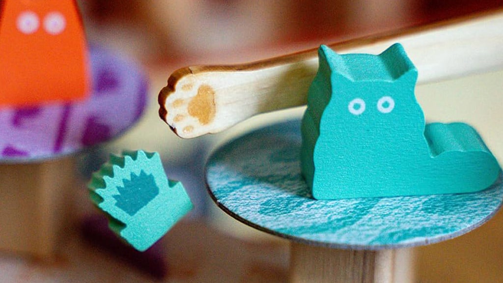 In this silly stacking game, players take turns building a wobbly tower, carefully balancing kitties, and batting cat toys over the side with sticks. The farther the toys tumble, the more points you’ll win — just don’t knock the tower over by accident!