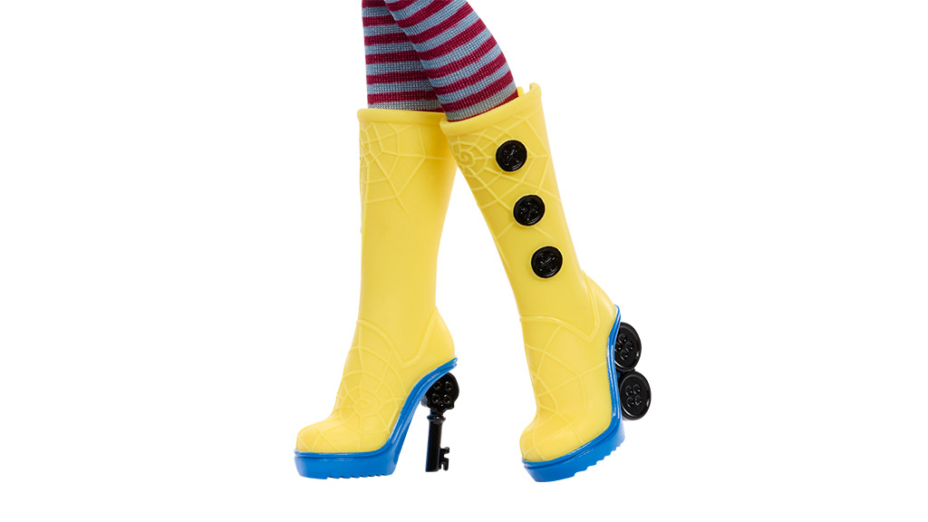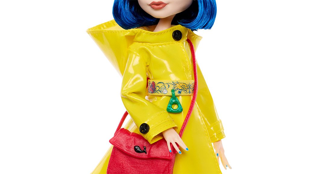 Available March 13, the Coraline doll wears a creepy couture version of her outfit from Laika’s stop-motion animated film. Her iconic glossy yellow raincoat pairs perfectly with a burgundy key-patterned dress, while her striped socks, black hat, dragonfly hair clip, and spiderweb rain boots add an extra dimension to the details.